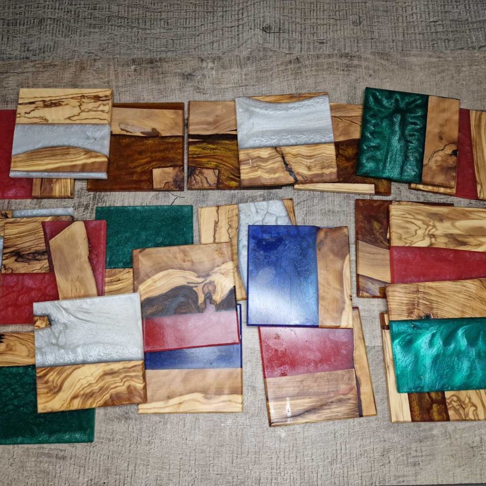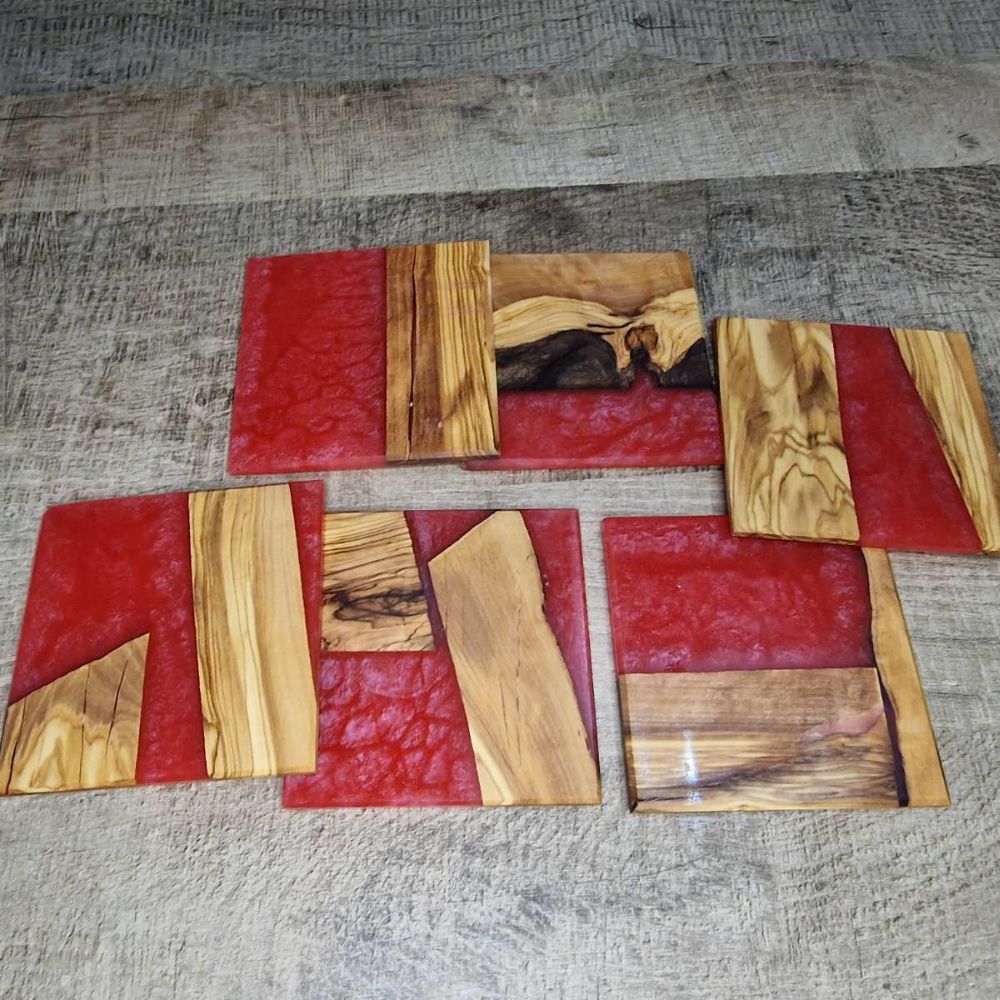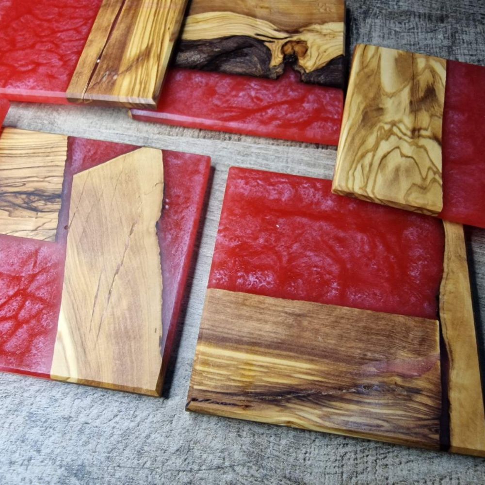 Σετ από σουβέρ σερβιρίσματος, από ξύλο ελιάς και κόκκινη ρητίνη (υγρό γυαλί).